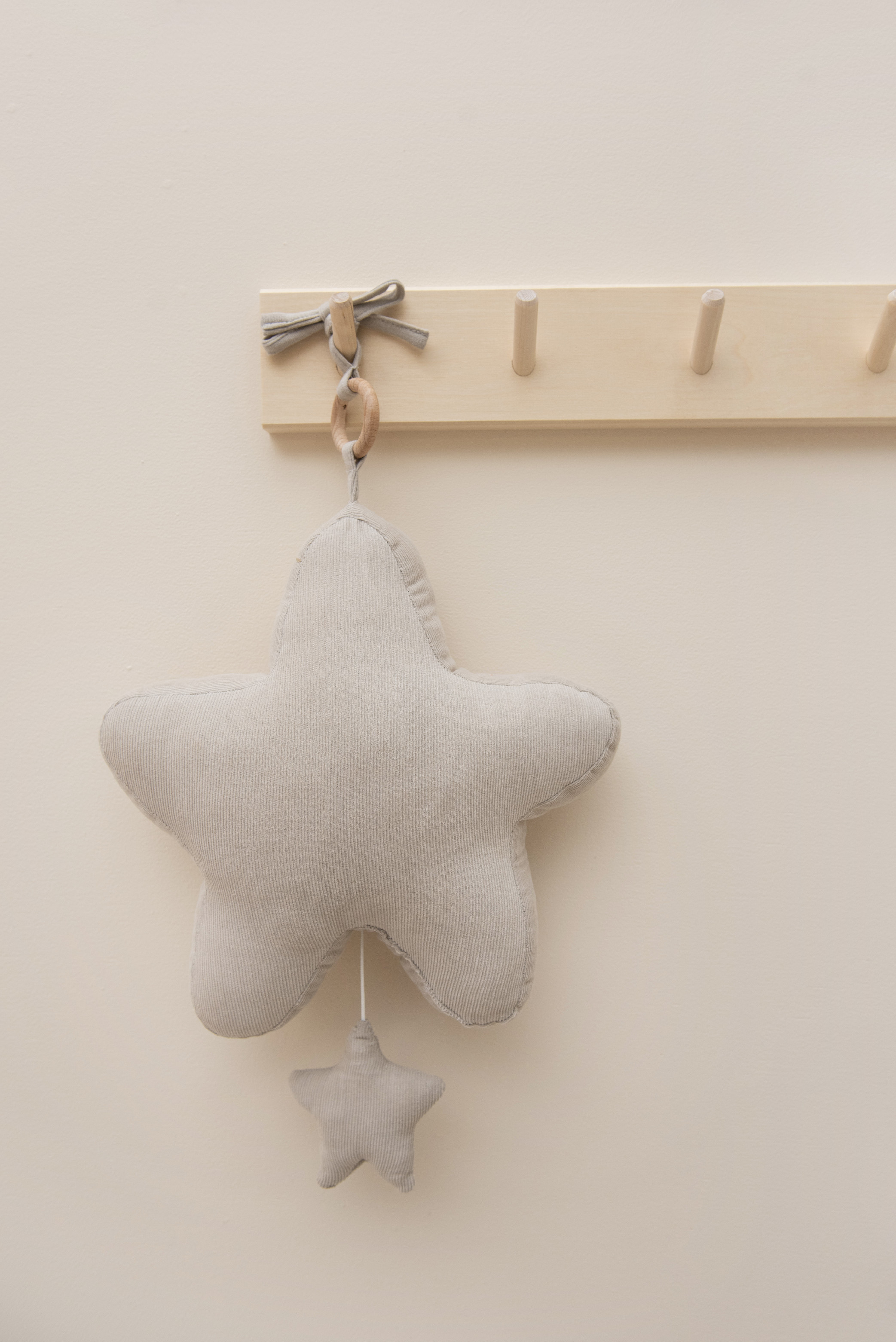 Krásná hrací hvězdička pomůže každému malému děťátku s usínáním. Připevníte buď zavěšením na dřevěné kolečko nebo zavěsíte na provázky. Oboje je součástí hvězdy.