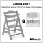 Alpha+ SET Vysoce kvalitní jídelní židle ze dřeva s prémiovým nátěrem s pohodlným polstrováním Mezi-nožní pás v koženém vzhledu Vysoce kvalitní lazurování Povrchově ušlechtilé kovové prvky Rostoucí od 6 měsíců - na celý život Obzvláště stabilní, odolná proti převrhnutí, zátěž do 90 kg Přírodní produkt z evropského bukového dřeva Výškově nastavitelné sedadlo a opěrka nohou 2 bezpečnostní pásy pro ještě větší bezpečnost Včetně ALPHA+ ochranného oblouku