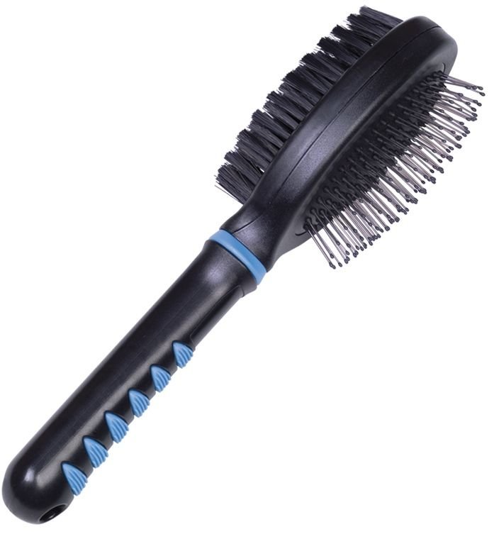 Oboustranný univerzální kartáč Nobby z kolekce Comfort Line. Kartáč z jedné strany ocelové hroty s plastovými krytkami a z druhé strany s nylonovými štětinami, je vhodná pro všechny psy. Ocelový hroty s plastovou ochranou masírují pokožku a podporují krevní oběh zvířete. Nylonové štětinky zajišťují finální úpravu srsti, čistí a leští. Plastová rukojeť je v ruce bezpečná a pohodlná a zajišťuje pohodlné čištění.