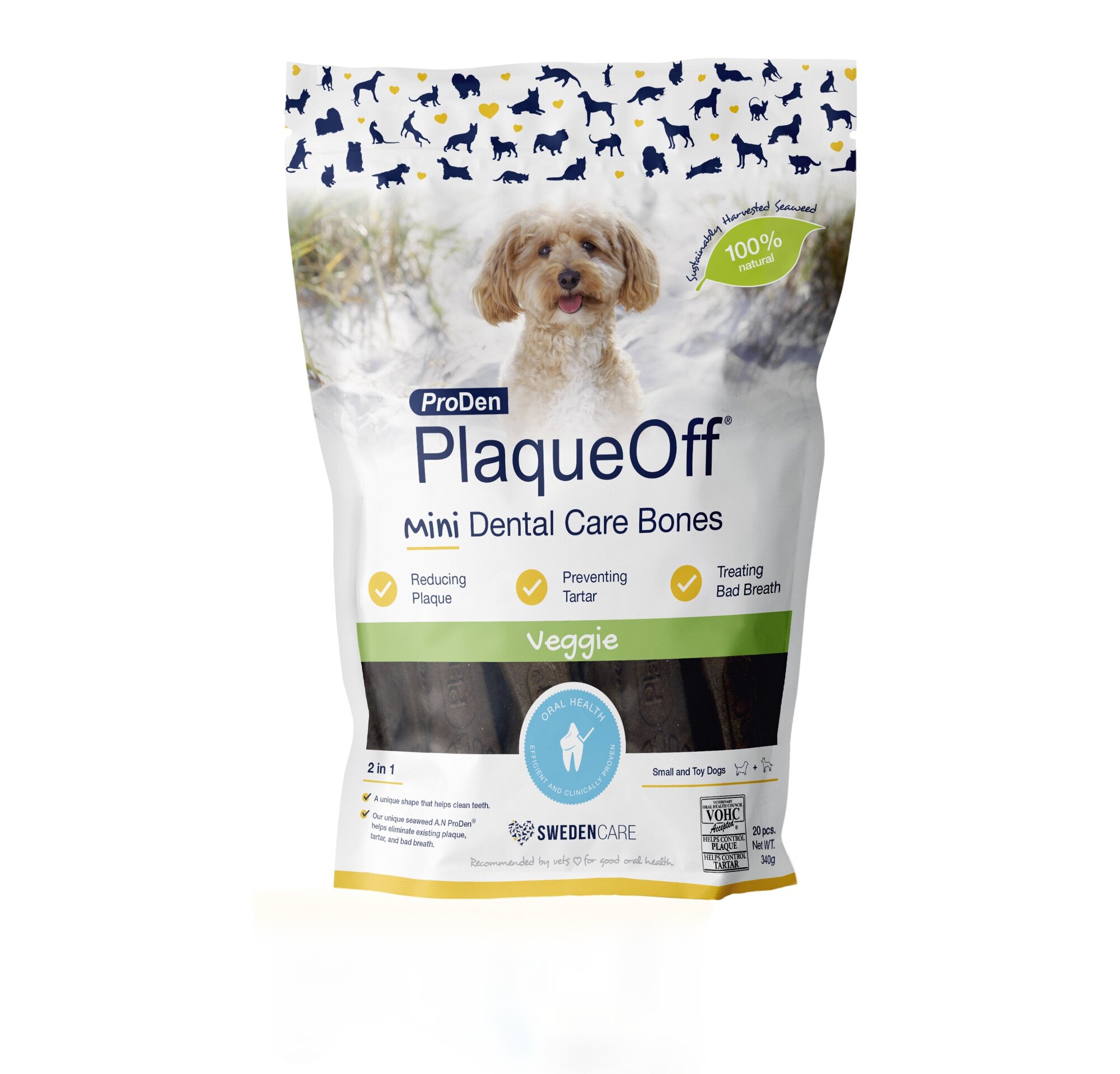 ProDen PlaqueOff® Mini Dental Bones jsou žvýkací kosti s osvědčeným práškem PlaqueOff® jako jednou ze složek. Pokud používáte denně, tento přírodní produkt vyrobený z řas může výrazně doplňovat běžnou zubní hygienu.
