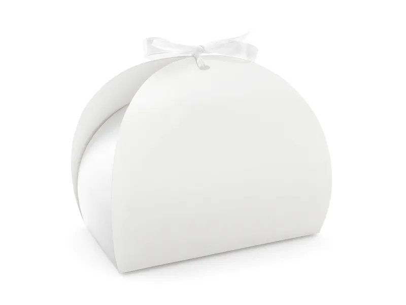 Bílá papírová krabička na výslužku se zaoblenými tvary a mašlí, která na svatbě nesmí chybět. Každý host si tak ze svatby odnese svou část. Rozměry: 16,5 x 14 x 9,5 cm. Balení: 1 ks. číst celé