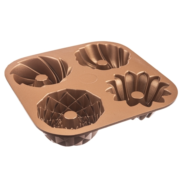 Designová forma na přípravu čtyř menších bábovek, muffinů, pudinku, aspiku i nádivky o průměru 10 cm, v luxusně vypadajícím provedení a barvě mědi. Forma je nejen praktická, ale také působivá. Bude navíc krásnou dekorací v moderní i rustikální kuchyni.