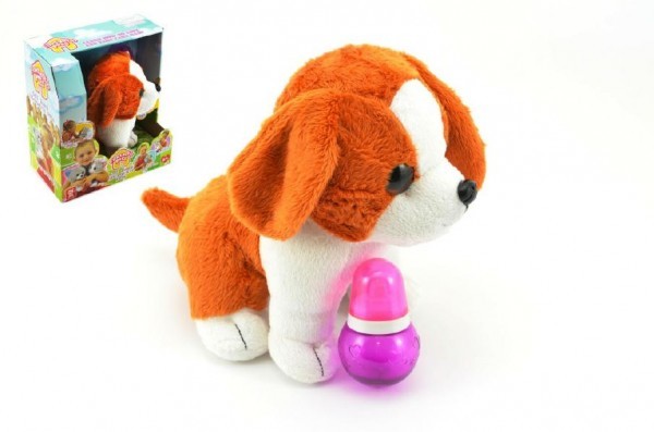 Plyšový pejsek vydává zvuk, když pije z lahve, když ho pohladíte po tváři a hlavičce a také, když mu dáte polibek. Rozměr: 23 cm, na baterie, v krabici Rozměr balení: 25,5 x 28 x 14,5 cm Vhodný od 3 let číst celé