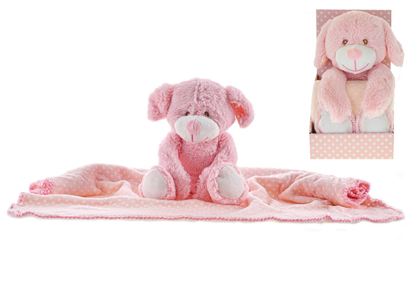 Krásná deka 75 x 75 cm z jemného příjemného materiálu pro miminko v balení s roztomilým plyšovým pejskem. Pejsek má rozměr 26cm. Celý set je laděný do růžové barvy. Vhodné pro holčičky. číst celé