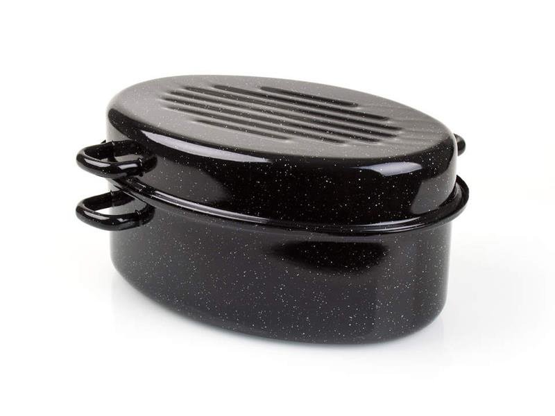 Dvoudílný oválný smaltovaný pekáč 6,5 l, rozměry pekáče: délka 38 cm, šířka 26 cm, výška 17 cm, smaltovaná ocel tl. 0,7 mm.