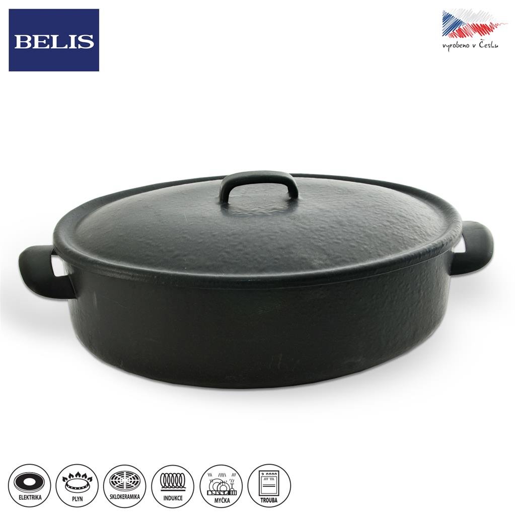 Pekáč se smaltovým povrchem a s poklicí - můžete použít jen minimální množství tuku při přípravě pokrmů. Materiál: 2mm plech se smaltovou povrchovou úpravou - nazýváno jako česká litina. Výborně vede teplo - nabízí ekonomické vaření. Vhodný na všechny typy tepelných spotřebičů včetně indukce, do trouby. Při manipulaci doporučujeme použít kuchyňské chňapky. Rozměry: 33(s uchy 40)x25x10,5/14(s poklicí) cm. Nádobí je vhodné do myčky na nádobí, ale je potřeba po umytí dobře osušit a uchovat v suchu. Vaření na smaltu je tím nejzdravějším možným způsobem přípravy pokrmů. Toto nádobí má navíc uvnitř nádob aplikován speciální modrý smalt, který má výborné kyselinovzdorné vlastnosti a zůstává po celá léta prakticky netknutý běžným používáním. Každý hrnec či pánev z této řady nádobí je originálem. Z vnějšku nádob je totiž ručně nanesena plasticita, která tento produkt dělá naprosto unikátním. Po každé aplikované vrstvě smaltu je nádobí vypáleno v peci o teplotě přibližně 850 °C. Tento způsob aplikace povrchu zajišťuje, že se Vám smalt rozhodně nesloupne po pár použitích jako je tomu například u různých keramickým či teflonových, které jsou nám masivně servírovány z médií všude kolem nás. Pro toto nádobí je charakteristický černý matný smalt vně nádob. Tento smalt je zprvu otevřený, a tak jsou na něm viditelnější stopy po otěru. Stopy se dají samozřejmě pohodlně umýt. Tento matný smalt se však po pár použitích a umytích zatáhne a získá klasickou, tmavě černou barvu.