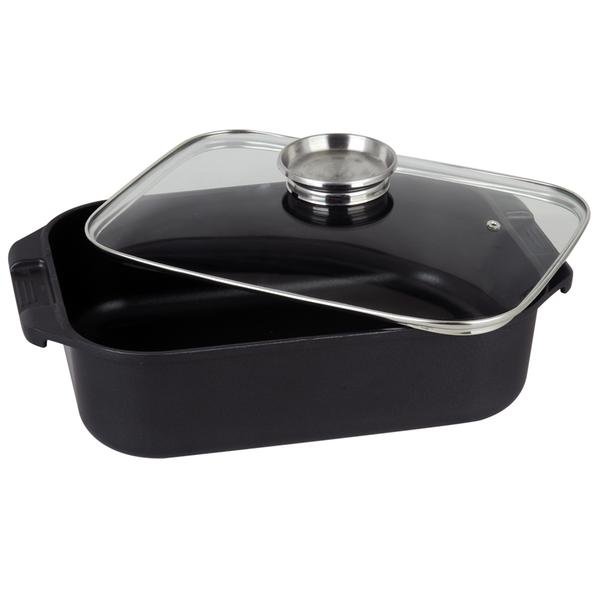 Pekáč se skleněnou poklicí patří mezi klasické pomocníky v domácnosti. Pekáč je hliníkový s nepřilnavým povrchem a se skleněnou poklicí. Poklice má masivní nerezový úchyt a otvor na odcházení přebytečné páry. Je vhodný na přípravu masa, zeleniny a dalších pokrmů. Vnější rozměry pekáče: 34,5x24,5x10cm. Vhodný na indukci i do trouby (max. 240 °C). Barva černá.