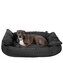 Pelíšek je vyroben z voděodolné tkaniny a má protiskluzové dno, takže zůstává stabilní i na kluzkých podlahách. Oboustranný polštář nabízí dva vzhledy v jednom, zatímco měkké, vysoké okraje poskytují oporu a ochranu před průvanem.