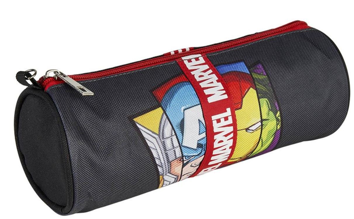 Atraktivní školní penál na tužky typu barelu s grafikou superhrdinů Avengers.
