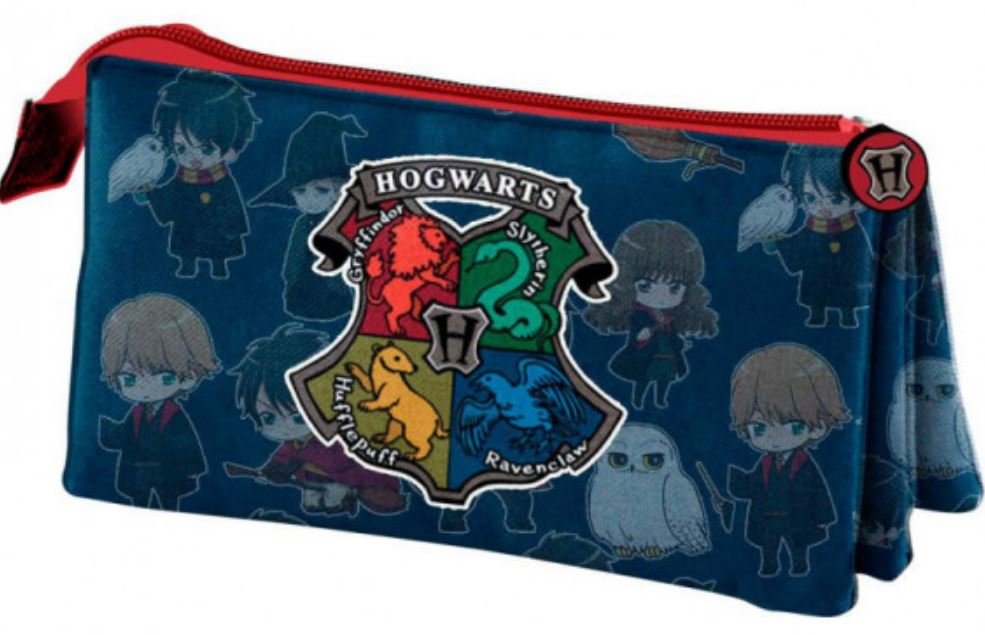 Penál na psací potřeby inspirovaný znakem školy čar a kouzel v Bradavicích s roztomilým kresleným pozadím hlavních postav.. Penál má tři kapsy uzavíratelné zipem.