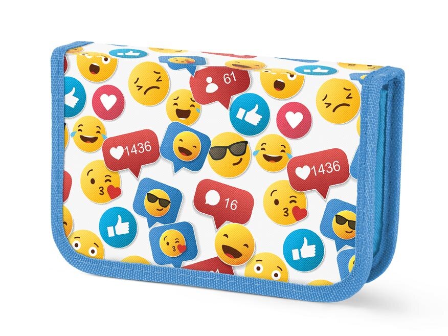 Školní Jednopatrový nevybavený penál Smile se dvěma chlopněmi s motivem smajlíků. Chlopně mají na vnější straně praktickou průhlednou kapsičku určenou na rozvrh aj. Penál obsahuje 23 poutek na pastelky, tužky a pera a 3 větší poutka např. na nůžky, gumu, ořezávátko nebo pravítko. Velice lehce se uzavírá díky velkému zipu. Bezesporu je nezbytnou součástí vybavení každého školáka.