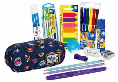 W zestawie oprócz saszetki znajdują się: długopis z wkładami, ołówki, temperówka, gumka do ścierania i gumka do tuszu, klej, flamastry, zakładki indeksujące, cyrkiel.