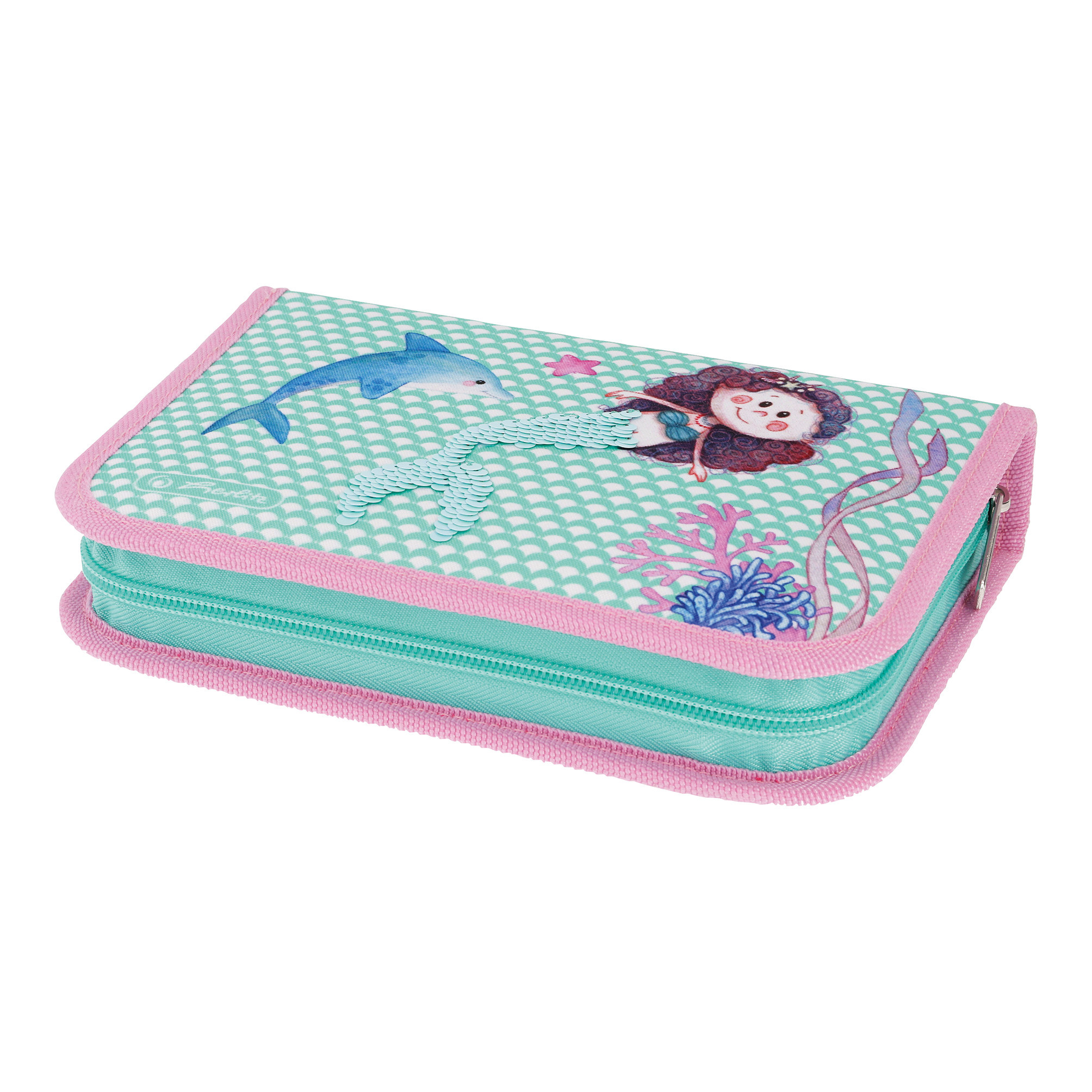 2 chlopněmi, vnitřní podšívka: barevná, náplň: 14 fixů, 8 šestihranných pastelek, 2 tužky šestihranné, 1 plastové ořezávátko, 1 guma, 1 plastové pravítko 16 cm, 1 trojúhelníková geometrie, 1 kuličkové pero, 1 rozvrh, 1 vizitka