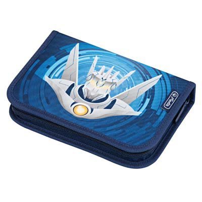 20,3 x 14 x 3,5 cm, 31 dílů - 14 fixů, 8 šestihranných pastelek, 2 tužky, ořezávátko, guma, 16 cm pravítko, trojúhelník, kuličkové pero, rozvrh hodin, vizitka, materiál: polyester