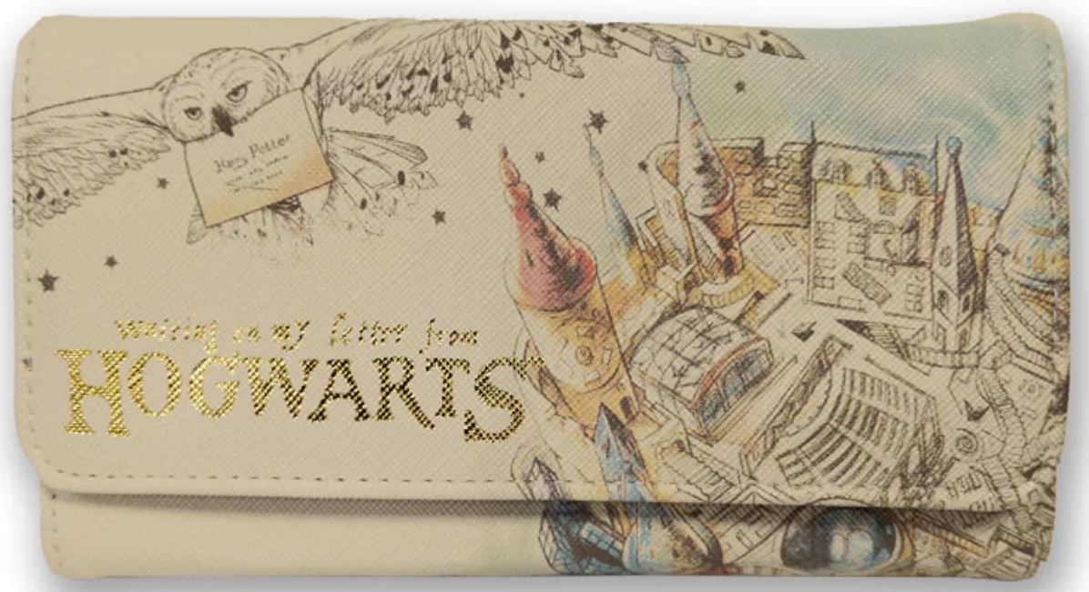 Béžová dámská peněženka s grafikou Školy čar a kouzel v Bradavicích a na přední části peněženky je vyobrazena sova Hedvika, jak nese přijímací dopis. Peněženka je vhodná pro všechny fanoušky Harryho Pottera.