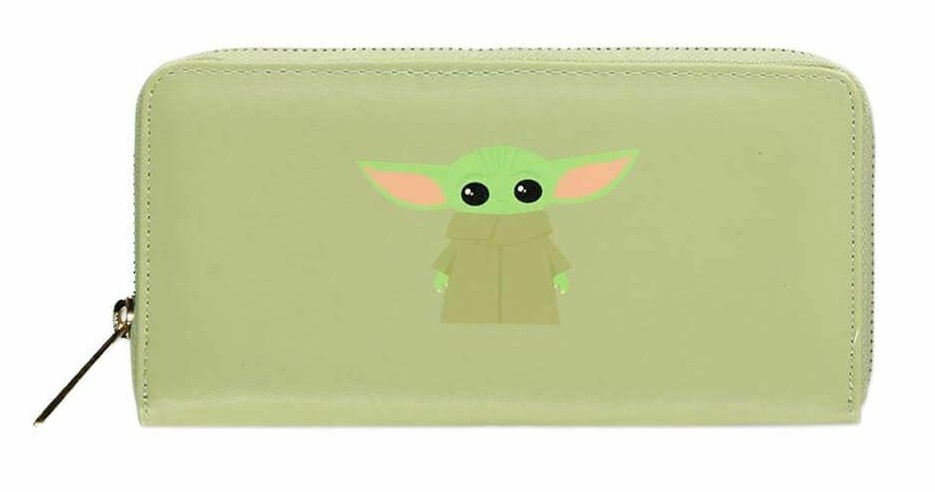 Zelená peněženka (psaníčko) se zapínáním na zip a motivem Yody na přední části. Peněženka má přihrádky na karty a zapínací část na mince.