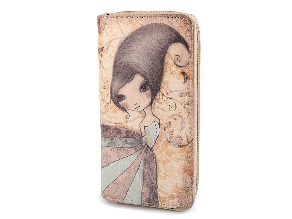 Vintage peněženku si zamilují všechny romanticky založené ženy i dívky. Zdobí ji kouzelné obrázky dívek, které vypadají jako by vystoupily z pohádky. Peněženka je vyrobená z eko kůže a je velmi prostorná. Má vnitřní členění pro vkládání dokladů. Obsahuje tři velké přihrádky na papírové bankovky a uzavíratelnou kapsu na drobné mince na zip. Přihrádek na kreditní karty nebo vizitky je osm. Uvnitř na bocích jsou ještě dvě dlouhé přihrádky, do kterých se vejdou např. účtenky.