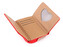 Peněženka je členěná na 2 samostatné oddíly. Po otevření klopy, která se uzavírá na patent, se objeví oddíl na kreditní karty, vizitky a velká zadní kapsa na bankovky. Jedna přihrádka má průhled v podobě srdce. Druhý oddíl má kovový rámeček se zapínáním, je určený na drobné mince.