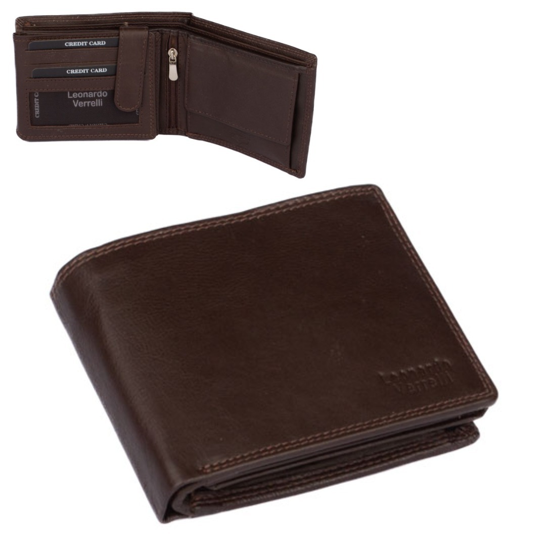 Pánská kožená peněženka tmavě hnědá se světlým prošíváním má dostatek kapes na karty, bankovky i mince. Některé kapsy na karty jsou průhledné. Mincovník je klasický, s klopou a pevným drukem. Pánská kožená peněženka tmavě hnědá je vyrobena z pravé kůže hnědé barvy a je značky Leonardo Verrelli. Peněženka je dodávána bez dárkové krabičky.