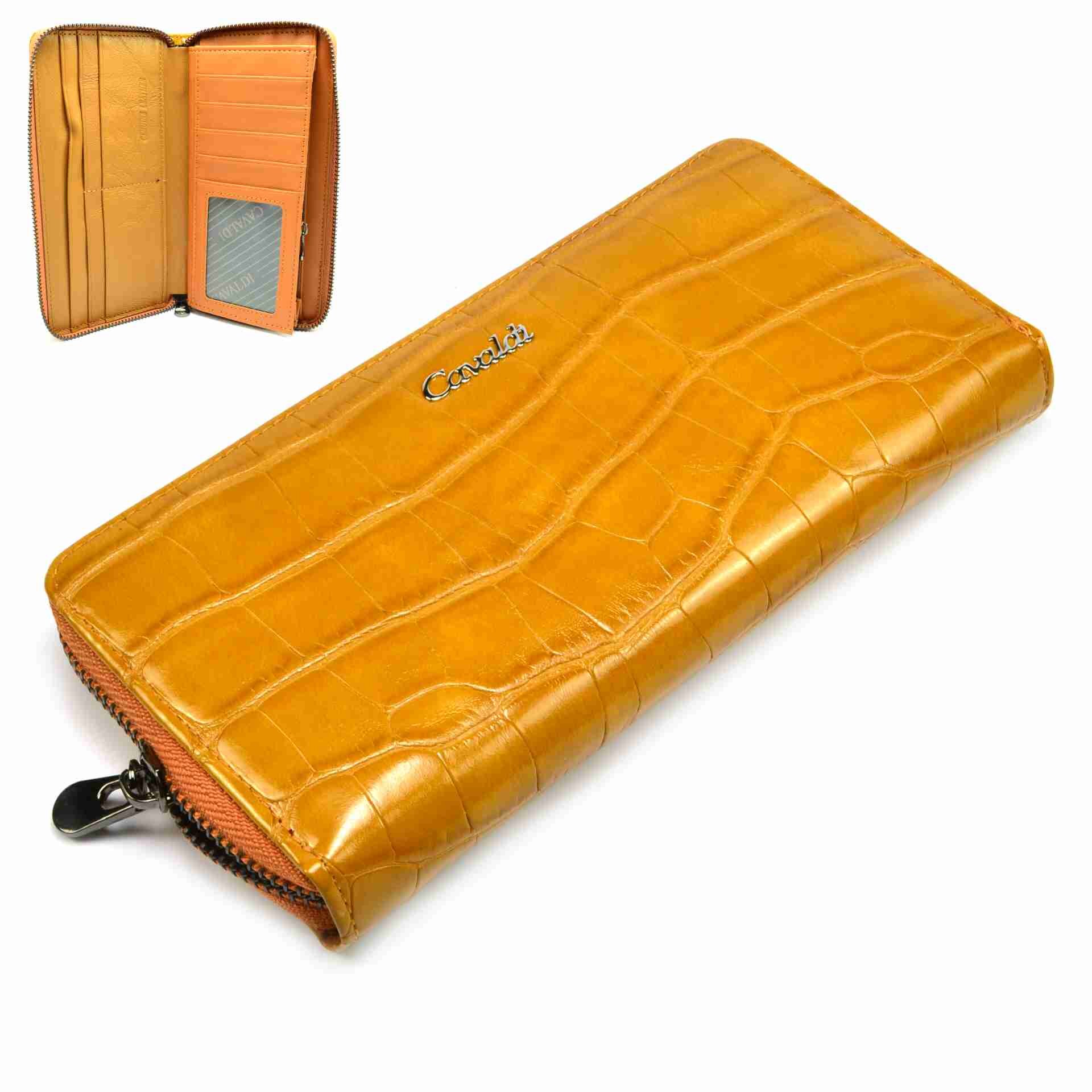 Hnědá dámská kožená peněženka ve světle hnědé barvě zvenku, má uvnitř klasické uspořádání. Po otevření peněženky zipem s velkým jezdcem pro pohodlné otevírání jsou přístupné kapsy na karty, jedna z nich je průhledná. Za kapsami na karty jsou tenké kapsy. Na boční straně peněženky jsou dvě velké kapsy na bankovky a mezi nimi je mincovník, uzavíratelný zipem. Peněženka je uvnitř vyrobena z pravé kůže, z vnější strany je z umělé kůže pro větší stálost barev. Peněženka je dodávána v dárkové krabičce a je značky 4U Cavaldi.