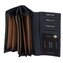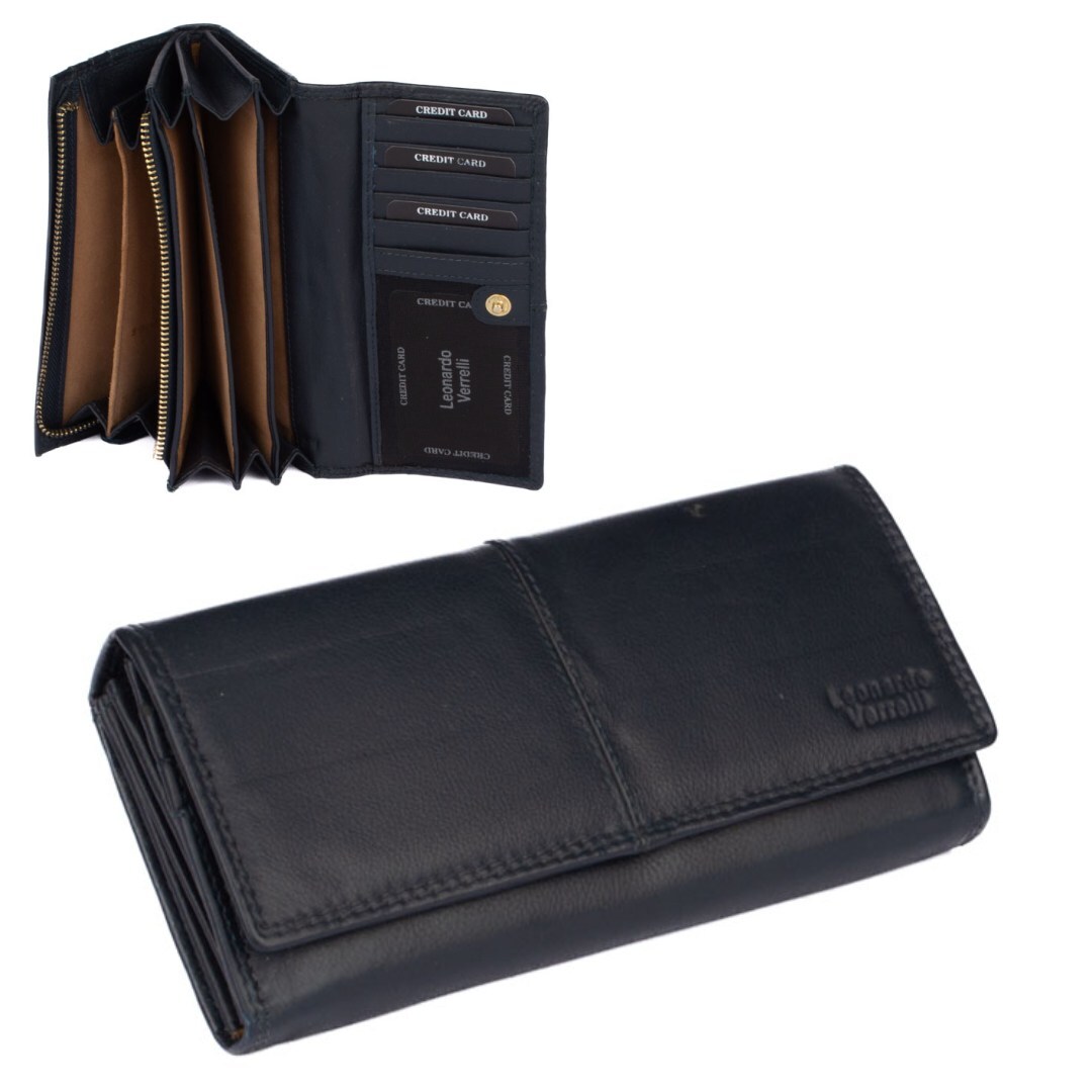 Dámská luxusní kožená peněženka z pořádné pravé kůže se stane vaším oblíbeným doplňkem. Peněženka se uzavírá klopou s pevným drukem. Po otevření klopy jsou na její vnitřní straně kapsy na karty, jedna z nich je průhledná. Další kapsy jsou v druhé části peněženky, na boční straně mincovníku. Kromě nich jsou v peněžence také velké kapsy na bankovky a tenká kapsa. Dámská luxusní kožená peněženka má uvnitř velký mincovník uzavřený pořádným zipem s velkým jezdcem, který zajistí pohodlné otvírání. Uvnitř je kapsa na žeton do košíku. Na zadní straně peněženky je jedna tenká kapsa a jedna kapsa na zip, přístupná bez nutnosti otevřít peněženku. Tato dámská luxusní kožená peněženka je vyrobená z pravé kůže tmavě modré barvy a je značky Leonardo Verrelli. Peněženka je dodávána v dárkové krabičce s logem výrobce.