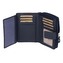 Barevná kožená dámská peněženka tmavě modré barvy je rozdělena na dvě poloviny. První polovina se uzavírá přezkou s pevným drukem. V této polovině jsou kapsy na karty a doklady, některé z nich jsou průhledné. Samozřejmostí jsou dvě velké kapsy na bankovky. V druhé polovině je velká kapsa, která se uzavírá zipem bez nutnosti otevřít peněženku. Tuto kapsu lze využít jako mincovník a je rozdělená na dvě poloviny. Barevná kožená dámská peněženka je značky Dariya Bags.