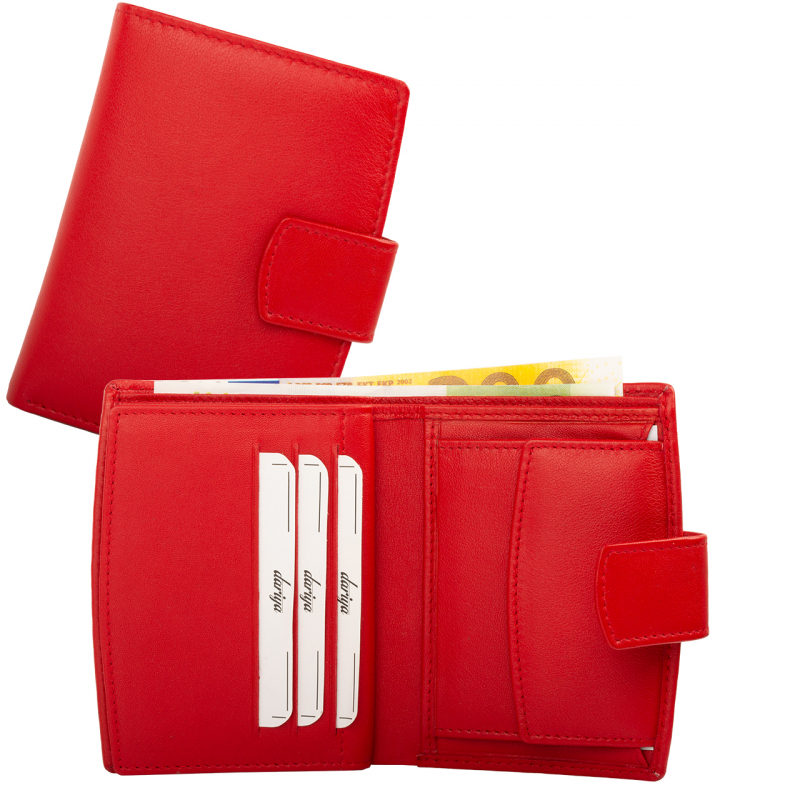 Červená peněženka kožená dámská z pravé kůže červené barvy se uzavírá přezkou s pevným drukem. Po otevření peněženky jsou přístupné všechny kapsy na karty, jedna z nich je průhledná. Bankovky uložíte do dvou kapes přes celou šíři peněženky. Mincovník peněženky je klasický, uzavíratelnou klopou s pevným drukem. Peněženka dámská malá je vyrobena z pravé kůže černé barvy a je značky Dariya Bags. Peněženka je dodávána bez dárkové krabičky.