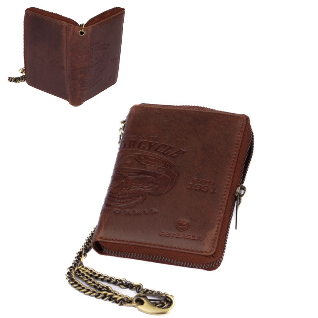 Peněženka pánská dokladovka kožená s dostatkem kapes a zavíráním na zip. Z venku je na peněžence netradiční ražba s moto tématem. Uvnitř je oblíbená klasika. Do dokladovky uložíte spoustu platebních karet a do průhledných kapes například i doklady. Na bankovky má peněženka dvě velké kapsy na bankovky. Samozřejmostí je mincovník uzavíratelný klopou s pevným drukem. Peněženka pánská dokladovka kožená je vyrobená z pravé kůže hnědé barvy, je značky Peterson a je dodávána v dárkové krabičce.