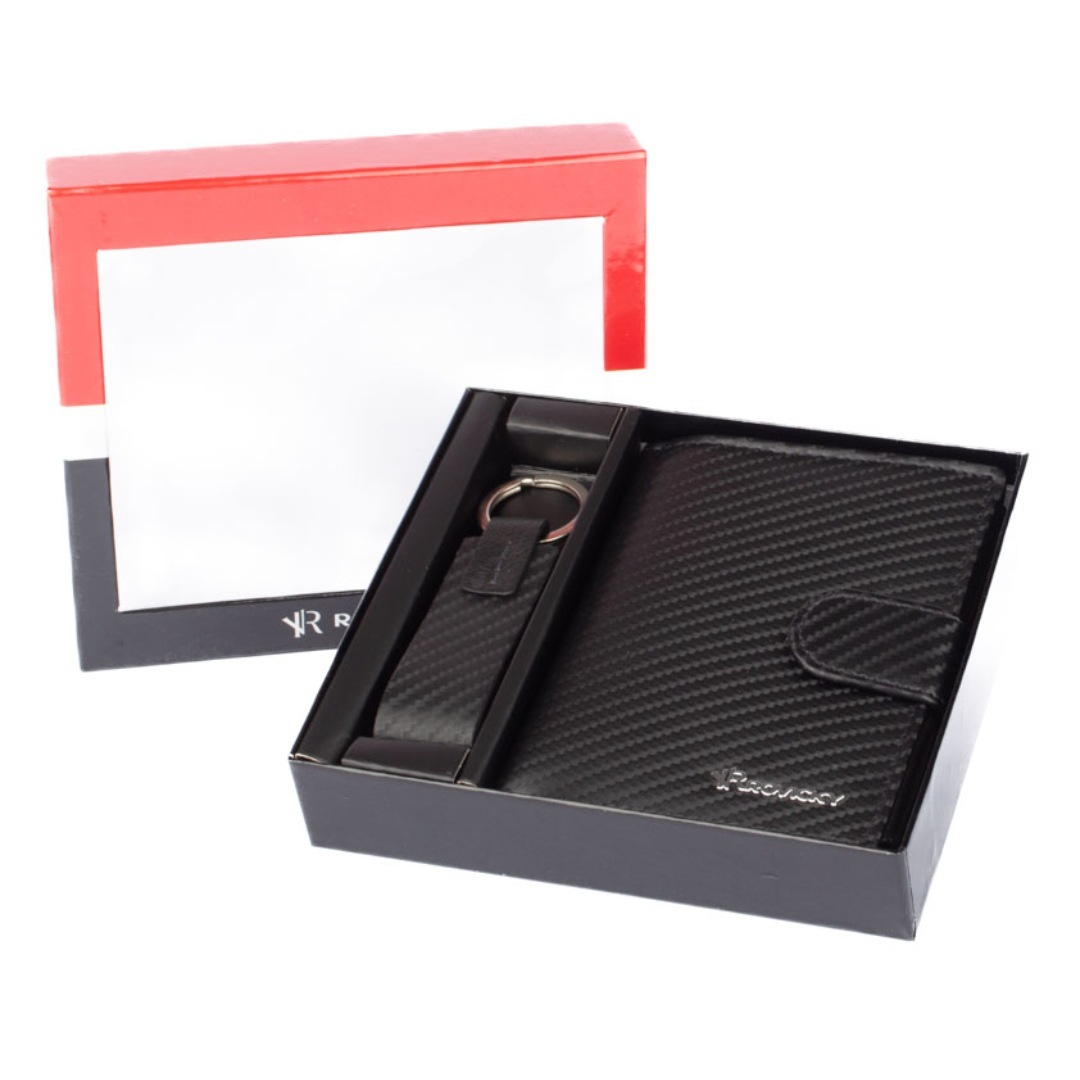 Luxusní sada peněženky s klíčenkou je vyrobená z pravé kůže černé barvy. Na povrchu má jemné vzorování. Peněženka i klíčenka jsou vyrobené ve stejném designu. Díky tomu k sobě dokonale ladí. Sadu dodáváme v originální dárkové kazetě.