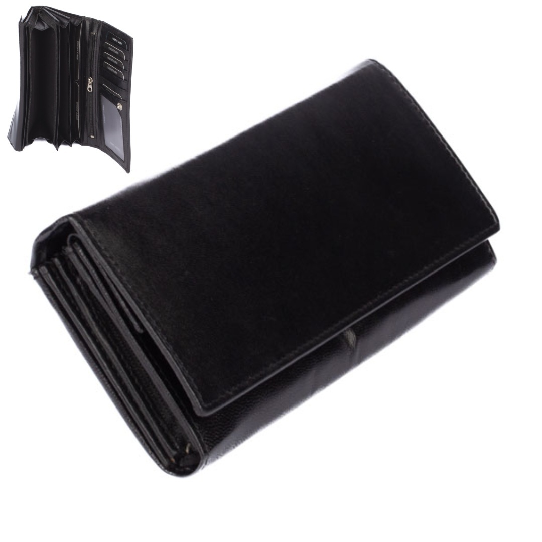 Praktická dámská černá peněženka je ideální do všech kabelek. Dámská černá peněženka se uzavírá klopou s pevným drukem. Po otevření klopy jsou v jedné části peněženky hned přístupné kapsy na karty, jedna z nich je průhledná. V druhé části peněženky je další klopa s menší kapsou přes celou peněženku. Uvnitř peněženky jsou velké kapsy na bankovky přes celou peněženku. Mincovník se uzavírá zipem a je prošitý až na dno kapsy, takže žádné drobné nebudete nikde trousit. Peněženka je vyrobena z pravé kůže černé barvy, je značky Cavaldi a je bez loga výrobce. Peněženka je dodávána v dárkové krabičce.