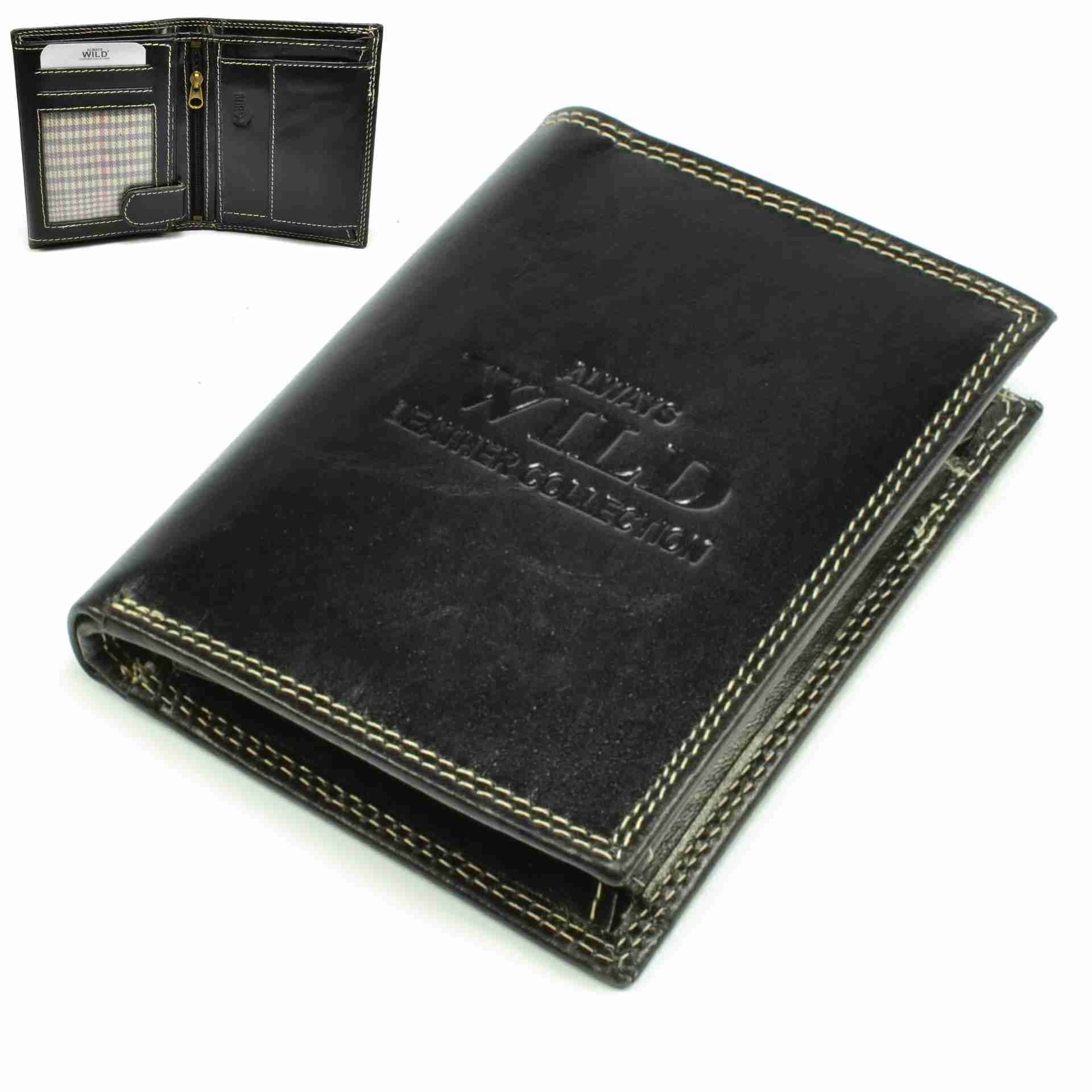 Pánská kožená peněženka klasické černé barvy má atraktivní vzhled díky světlému prošívání. Tato velká kožená peněženka pojme vše, co do peněženky patří. Uložíte do ní přehledně dostatek karet do kapes na karty, velké průhledné kapsy slouží k uložení například dokladů a samozřejmostí jsou velké kapsy na bankovky. Mince se vejdou do velkého mincovníku s klopou a pevným drukem. Pánská kožená peněženka je vyrobená z pravé kůže černé barvy a je z kolekce Always Wild. peněženka je dodávána bez dárkové krabičky.