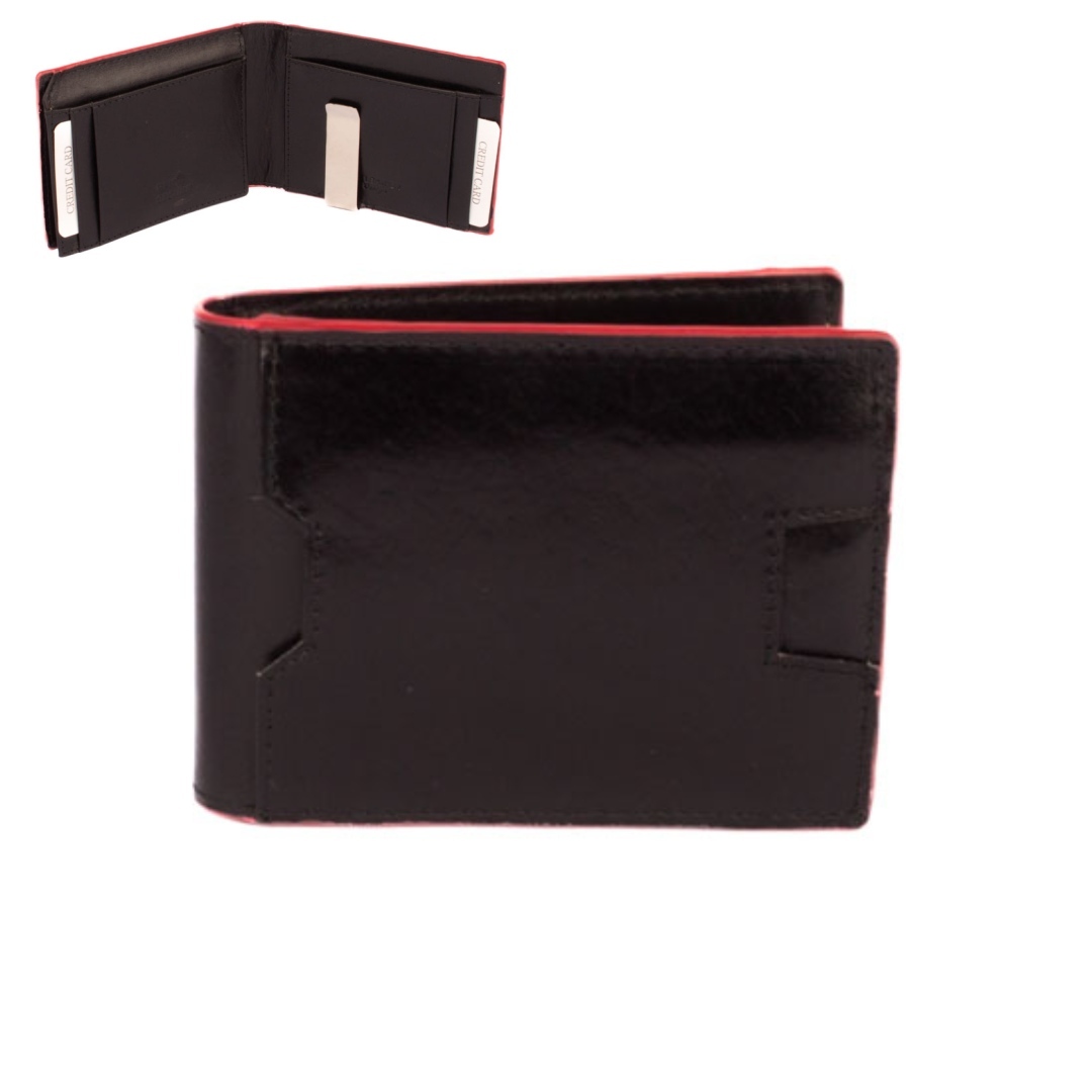 Pánská kožená dolarka černá s kapsou na přední straně a červenou hranou. Uvnitř dolarky je kromě klasické spony na bankovky také několik kapes na karty, jedna z nich je průhledná. Pod vnitřní klopou s pevným drukem je menší mincovník, vhodný na pár mincí. Pánská kožená dolarka černá je vyrobena z pravé kůže černé barvy a je dodávána v dárkové krabičce. Peněženka je vybavena ochranou proti čtení RFID.