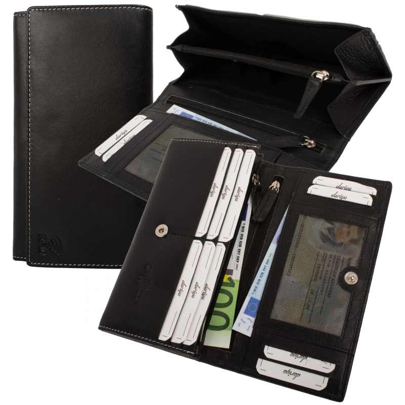 Moderní dámská peněženka z pravé velmi jemné kůže. Peněženka se uzavírá klopou s pevným drukem. Pod klopou jsou kapsy na karty, jedna z nich je průhledná. Další velké kapsy lze použít na bankovky. Jedna kapsa se uzavírá na zip a je vhodná jako mincovník. Tenké kapsy a další na zip poslouží k ukrytí vašich tajných papírků. Na zadní straně dámské peněženky je tenká velká kapsa přes celou šíři. Peněženka je vyrobena z pravé kůže a je značky Dariya Bags.