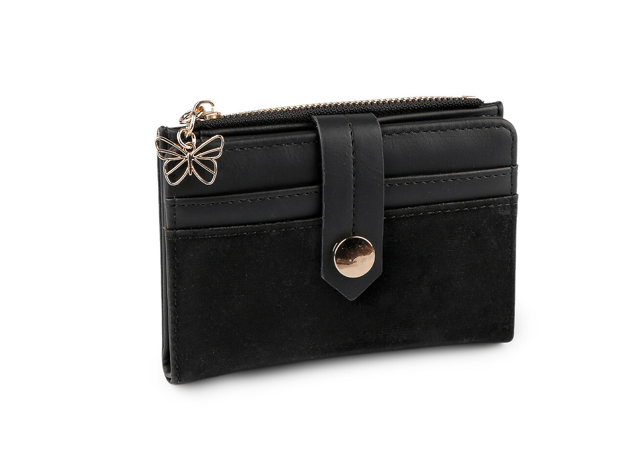 Přední strana peněženky se zapíná na zápinku s patentem. Uvnitř najdete 6 přihrádek na kreditní karty, z toho je jedna průhledná a přihrádku na bankovky. Kapsička na mince se zapíná na zip, je ozdobená přívěskem kovového motýla.