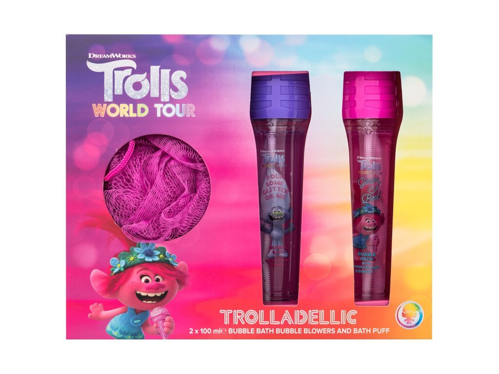 DreamWorks Trolls pěna do koupele Gimme A Beat! 100 ml + pěna do koupele Pour Some Glitter On Me 100 ml + mycí houba