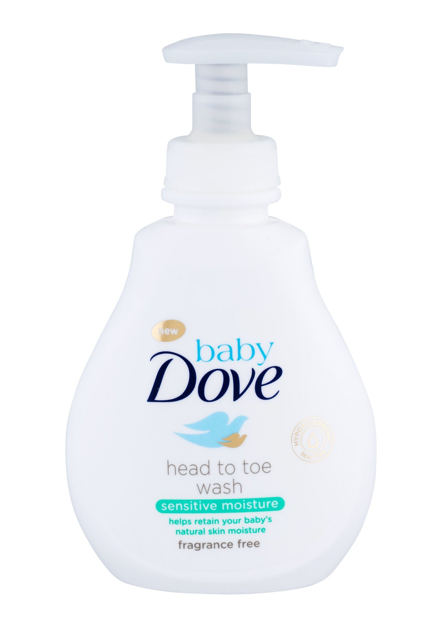 Dětský mycí gel bez parfemace **Dove Baby Sensitive Moisture Head To Toe Wash**. Mycí gel obohacený o 1/4 krému hydratuje jemnou dětskou pokožku až po dobu 24 hodin. Složení neobsahuje parfemace, barviva, parabeny a ftaláty, proto je vhodný i pro nejcitlivější ekzematickou pokožku. Vhodné i pro novorozence. S dětským mycím gelem Baby Sensitive Moisture Head To Toe Wash bude dětská pokožka krásně jemná a hydratovaná. **Použití:** Aplikujte na vlhkou pokožku a vlásky. Jemně omyjte rukama nebo žínkou. Důkladně opláchněte.