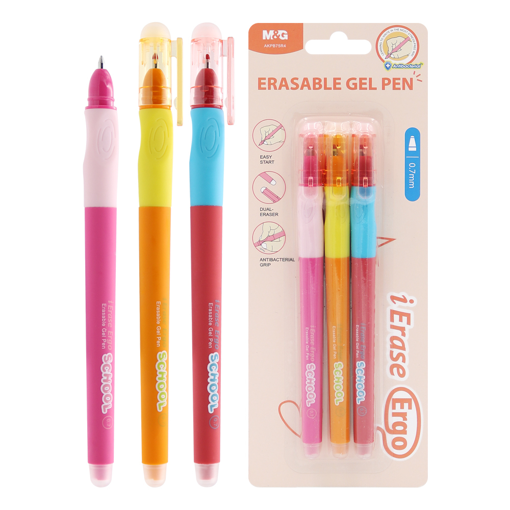 Blistr tří gumovacích rollerů od značky M&G, kategorie SCHOOL. Má dvojitou gumu pro odstranění inkoustu. Stopa hrotu je 0,7 mm. Ergonomický úchop, který je zároveň antibakteriální. Není vhodný pro oficiální dokumenty. Barva inkoustu je modrá.