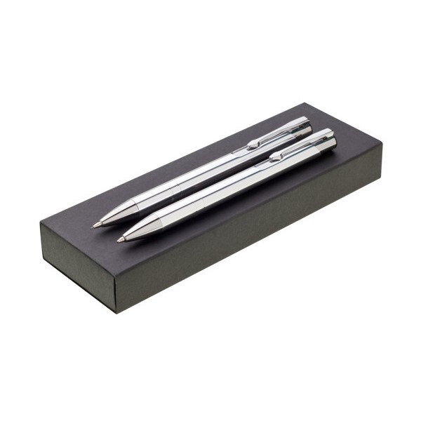 Psací potřeby mají na těle 2 proužky a doplňky ve stříbrné barvě.