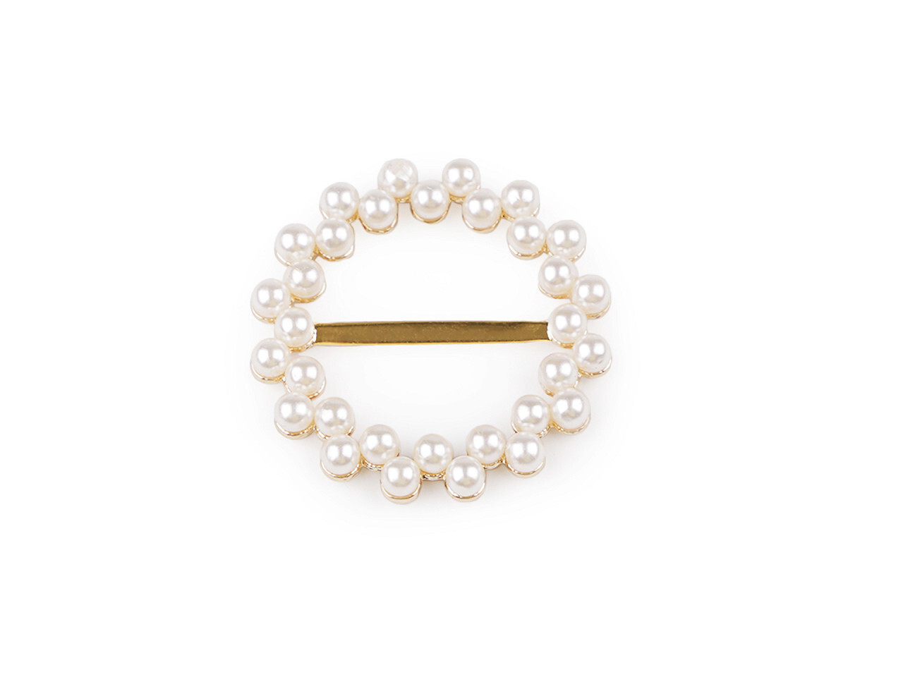 Tato kulatá perlová spona vyniká jednoduchostí a zároveň působivou elegancí. Uprostřed má praktickou tyčinku, přes kterou snadno provléknete stuhu nebo šátek, čímž vytvoříte originální a vkusný doplněk. Díky tomu je ideální nejen jako ozdoba na svatební polštářky či kytice nevěsty, ale také na kabelkách, kloboucích či fascinátorech a oděvech. Sponu můžete připevnit na stuhu nebo ji přišít přímo k látce, což umožňuje široké možnosti jejího použití.