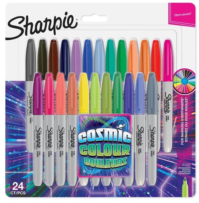 Kosmicznie jaskrawe i nadzwyczaj wytrzymałe markery permanentne Sharpie w Edycji Limitowanej Cosmic Colours zachęcają, by przekształcić zwyczajne powierzchnie w pasjonujące, twórcze kompozycje. Stworzone, by pisać praktycznie po wszystkim, żywe markery Sharpie pozwalają zapomnieć o nudzie. Oryginalny marker permanentny Sharpie zawiera ikoniczny, szybkoschnący tusz odporny na wodę i blaknięcie. Tam, gdzie imitacja zanika i blednie, kolorowe markery permanentne Sharpie pozostawiają trwały ślad. Dzięki dokładnej końcówce fine, stworzonej do pozostawiania znaków nie z tej ziemi, markery permanentne Sharpie ośmielają do wyrażania siebie.