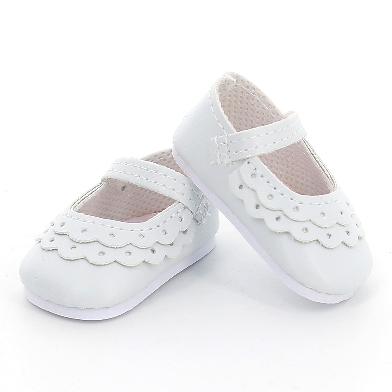 Pár bílých střevíčků zdobených krajkou, v imitaci kůže, určený zejména pro panenky Petitcollin řad Émilie, Francette, Marie-Françoise, Starlette a Finouche. Dodáváno v uzavíratelném plastovém sáčku. Hlavní vlastnosti:pro panenky o výšce 39-48 cm číst celé