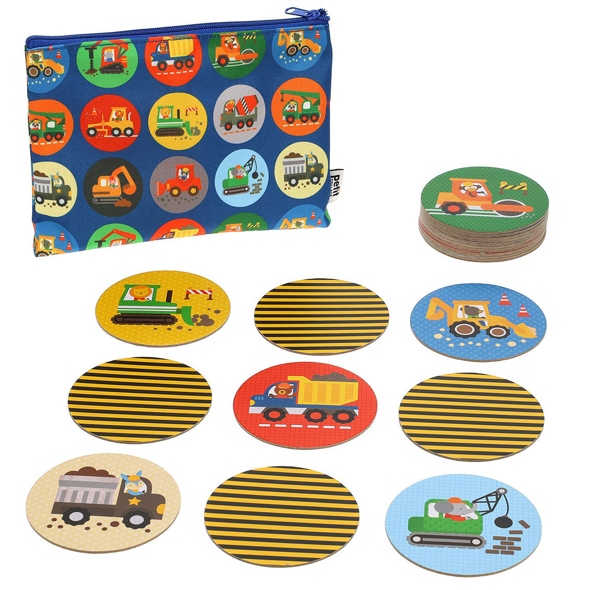 Krásné barevné pexeso pro předškolní děti, párujte stavební stroje. Hrou dítě rozvíjí rozpoznávání barev a paměť. Roztomilé ikony strojů řízených zvířátky jsou vyvedeny na kartičkách z recyklovaného papíru a baleny ve zdobené a praktické taštičce s uzavíráním na zip, vyrobené z odolného recyklovaného polyesteru. Hlavní vlastnosti: pro 2 hráče12 párů kartičekpraktické balení