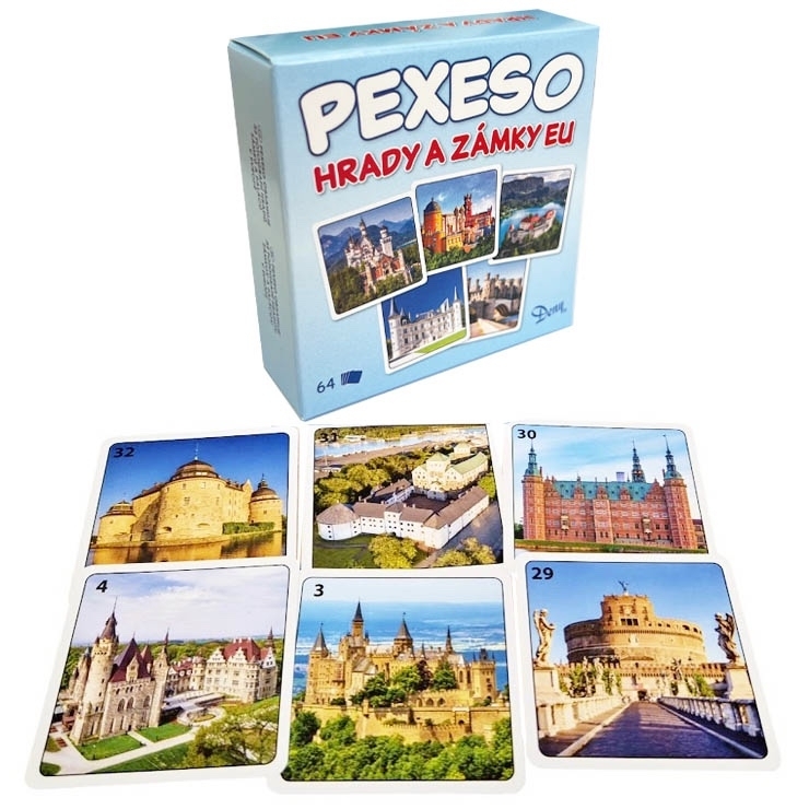 Pexeso Hrady a Zámky Evropy určena především dětem, ale i starším hráčům s velmi dobrou pamětí a postřehem. Pexeso je prakticky nastříhané v cestovní krabičce. Karty pexesa jsou nádherně ilustrovány a mají rozměr karty až 6,5cm. Balení obsahuje 64karet, 32 dvojic.