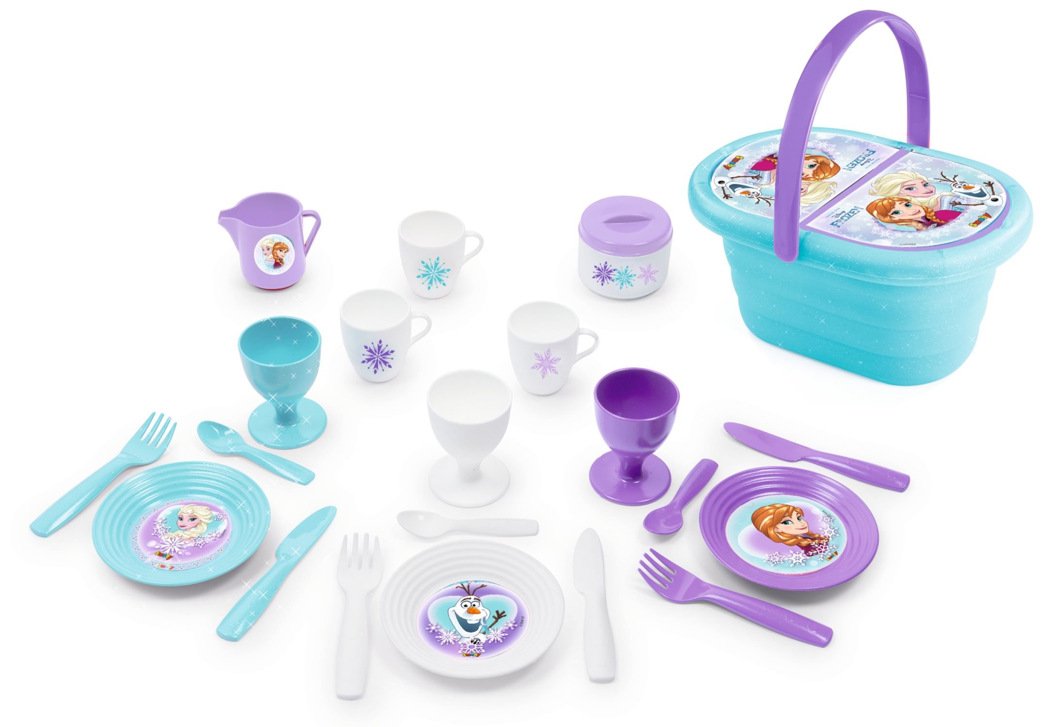 Třpytivý košík s oblíbenými postavičkami z filmu "Ledové království" je perfektní na malý piknik. Košík má dvě víka, pevné madlo a obsahuje šálky, hrníčky, pohárky, talířky, příbory, konvičku na mléko a cukřenku. Rozměry: 25,6 x 18,7 x 12,7 cm. Hmotnost: 0,395 kg.