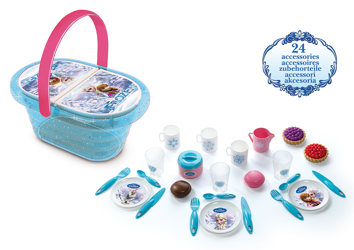 Třpytivý košík s oblíbenými postavičkami z filmu "Ledové království" je perfektní na malý piknik. Košík má dvě víka, pevné madlo a obsahuje šálky, hrnky, talíře, příbory, konvičku na mléko, cukřenku a koláčky. Celkem obsahuje 24 ks. Rozměry: 25,8x19,5x12,8 cm.