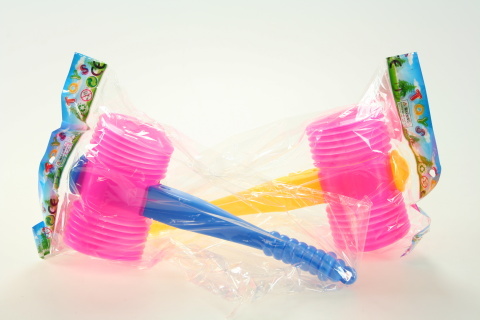 Kladivo o délce cca 28cm. Vrchní část je harmonikového tvaru a při stlačení píská. Věk 3+ číst celé