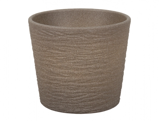 Matný keramický obal na květník je určen pro interiér. Má pískovaný povrch. Je 100% voděodolný, glazovaný. Průměr: 19 cm, výška: 17 cm. Barva: hnědo šedá.