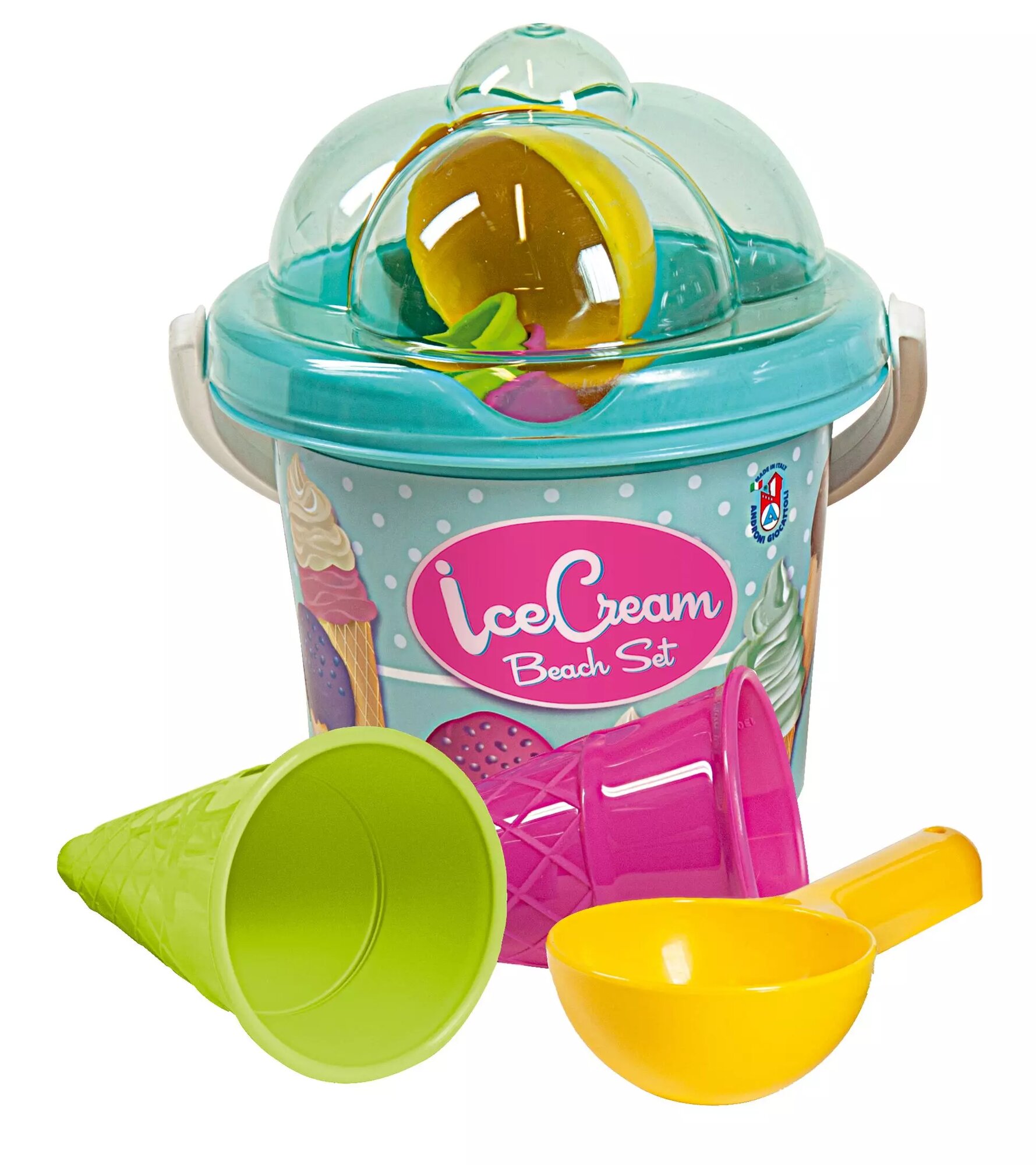 Tato 5dílná sada je vyrobena z kvalitního italského plastu, který je odolný a zároveň lehký - ideální pro malou dětskou ruku. Hlavním prvkem je kyblík ve tvaru zmrzlinového poháru s víkem, který má průměr 13 cm a výšku 11 cm. Součástí sady je také praktický kopečkovač na zmrzlinu a dva zmrzlinové kornoutky, které dotvoří hravé pískové pochoutky. Celková výška sady je 16 cm, a váha 0,26 kg zaručuje pohodlnou manipulaci i během hraní venku.