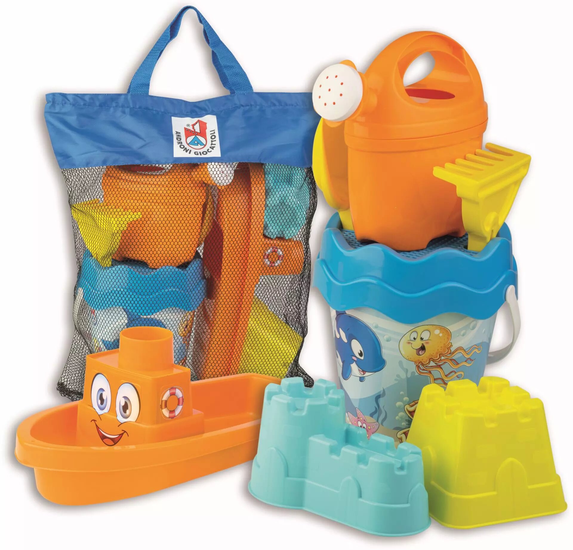 Tato sada je vyrobena z kvalitních italských plastů známého výrobce Androni Giocattoli a nabízí všechno potřebné vybavení, které děti potřebují k hraní na pláži či v pískovišti. Součástí je kyblík o průměru 17 cm, sítko na odstranění nečistot, praktická konvička s objemem 0,5 l, lopatka, hrabičky a dvě tvořítka - na hrad a loďku. Všechny tyto komponenty jsou uloženy v pohodlné síťované cestovní tašce, kterou snadno přenesete na jakékoli místo.