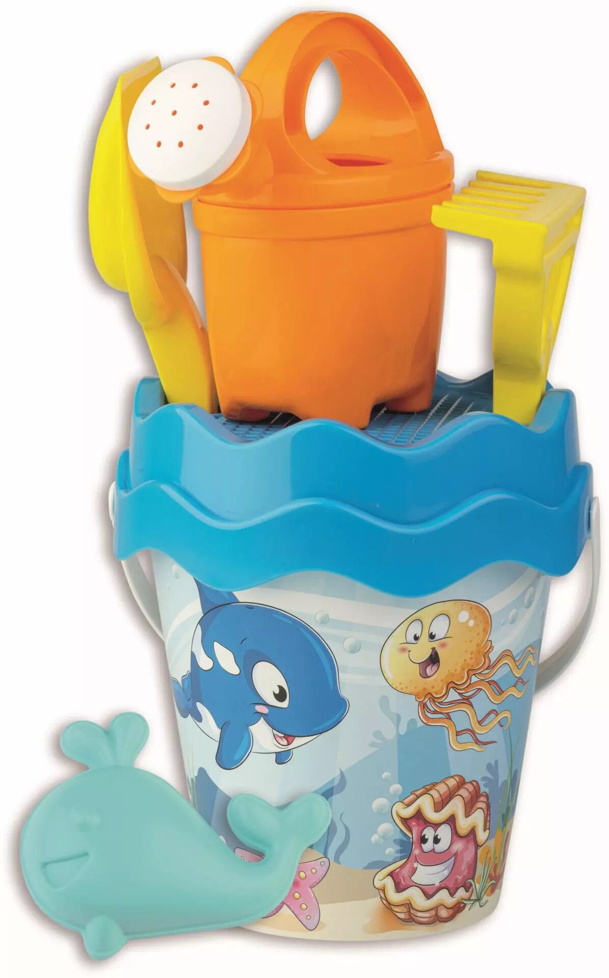 6dílná sada na písekTato sada na písek je vyrobena z kvalitních plastů v Itálii a obsahuje následující prvky: Kyblík: Průměr: 17 cm, Výška: 16 cm Konvička 0,5 l Sítko Lopatka Hrabičky Tvořítko ve tvaru velrybyRozměry sady: Výška: 35 cm, Váha: 0,42 kg